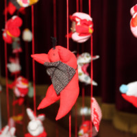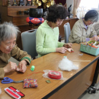 月1回活動があります。主に裁縫をしています。皆でつるし雛を作りました。針に糸が入らなくても職員がお手伝いします。 -